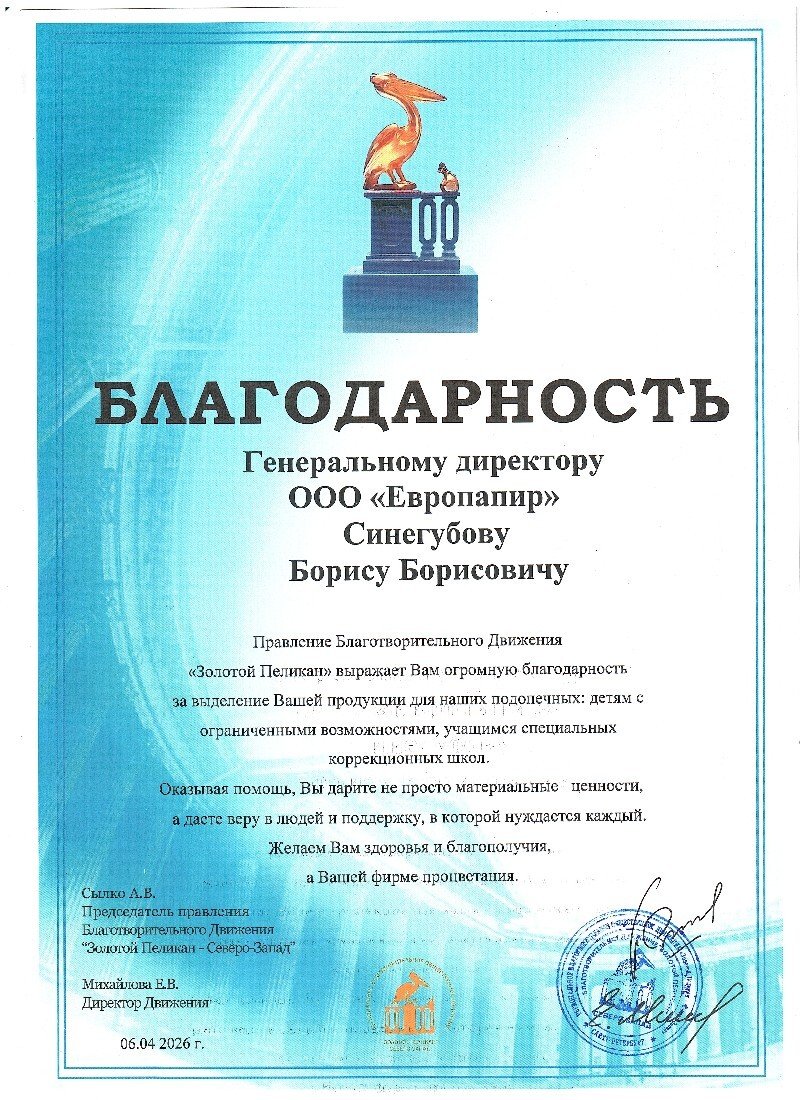 РБОД «Золотой Пеликан - Северо-Запад» выразило благодарность компании Европапир за содействие и поддержку в работе Движения.
