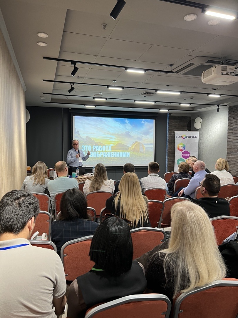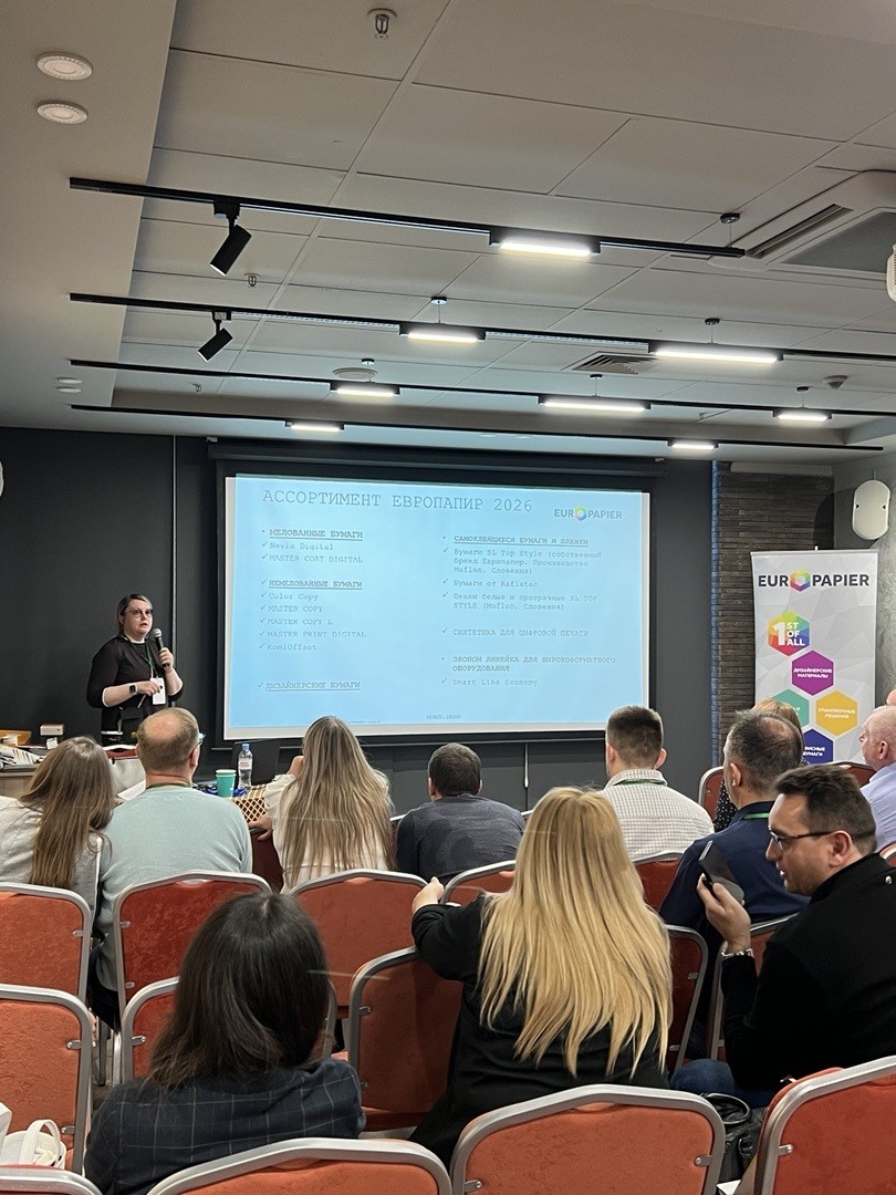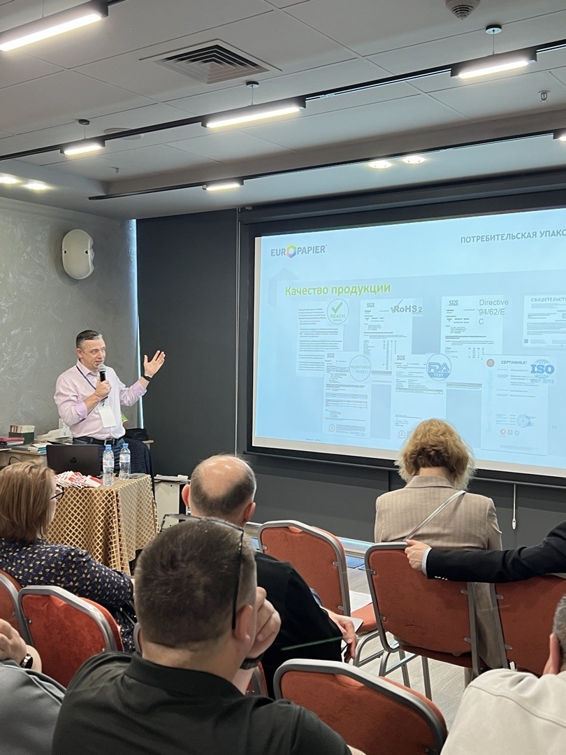 В программе семинара от Европапир выступили руководитель направления «Упаковка» и «Этикеточные бумаги» Вячеслав Брагин (доклад «Будущее в упаковке, основные тренды») и руководитель направления «Специальные материалы» Елена Родионова (доклад совместно с Александром Лукьянчуком из Konica Minolta «Новые возможности для цифровой печати: оборудование и материалы»).